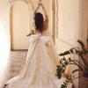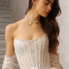 Chic and romantic, this exquisite Alençon lace ball gown features a strapless cut and contemporary cat-eye neckline. A structured, basque waist bodice features exposed boning and pearl embellishment. The lace-up, corset back is adorned with the designer’s signature statement-making bow.