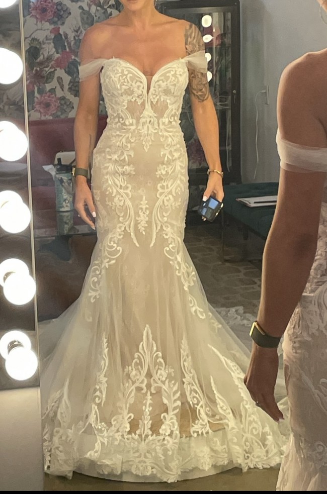 The off-the-shoulder neckline adds a touch of sophistication and highlights your collarbone beautifully, while the mid-back design offers a hint of allure. What truly sets this dress apart are the detachable sleeves, allowing you to customize your look for both the ceremony and reception. Transforming from a classic, regal appearance to a more relaxed, modern vibe at the turn of the moment makes this gown ideal for all aspects of your special day.