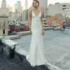 The Marnie V-neck satin bridal gown brings old Hollywood glamour into the 21st century in an effortlessly chic way. The V neck tapers up to a delicate spaghetti strap to highlight your shoulders and collarbone. The low scoop back has a barely there feeling, and the bias cut skirt slinks over every curve. The back flounce seam gives way to a dramatic court length train.