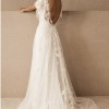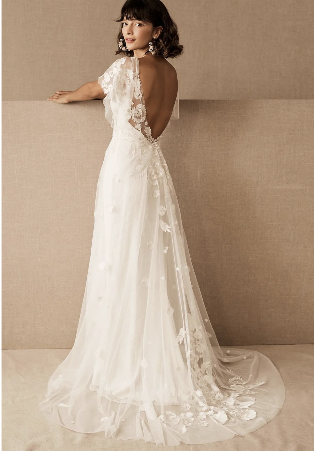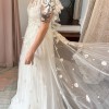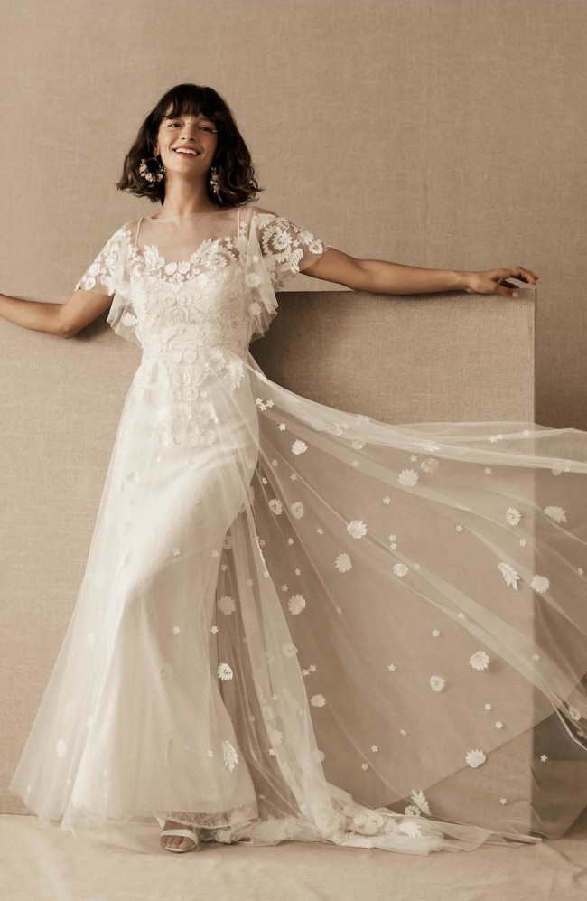 This gorgeous bridal gown inspired by modern folklore is crafted from Tillie Chantilly on soft netting. It features an illusion neckline, flutter sleeves, pearl buttons, and a velvet ribbon sash