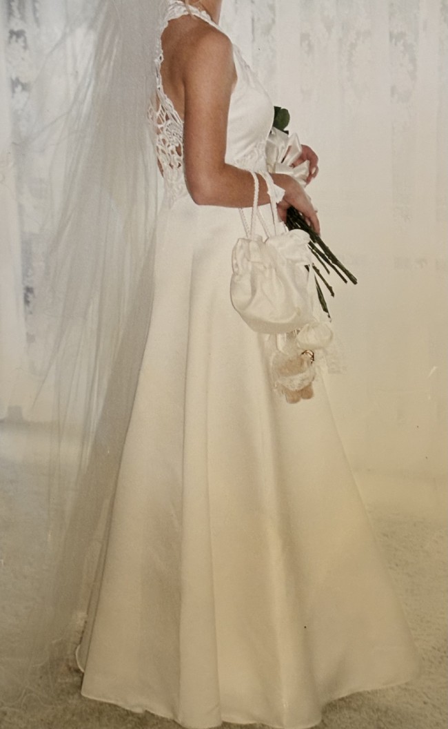 Beautiful House of Henri Josef wedding dress. Halter neck fully lined dress with guipure lace detail and guipure lace back. Ivory in colour. It was taken up to cater to my shorter height and breast cups added for secure coverage.