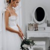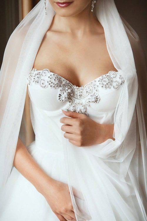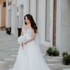 This elegant wedding gown features a sweetheart neckline adorned with intricate crystal embellishments, giving it a timeless and sophisticated look. Delicate straps and a fitted bodice seamlessly complement the flowing tulle skirt, which falls gracefully to the floor, creating a romantic and ethereal silhouette. The soft tulle overlay adds a dreamy touch to the design, while the train enhances its regal elegance. Perfect for brides seeking a classic and radiant style on their special day.