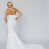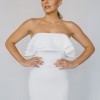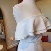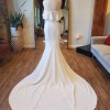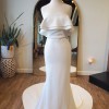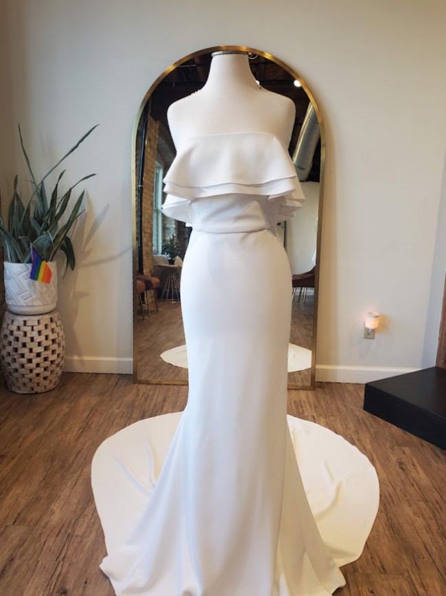 Newly discontinued, this whimiscal gown is a stunning modern and feminine fitted crepe wedding dress. It features a strapless neckline, double flounce, ruffle detail and long dramatic train. Alyssa Kristin believes that every bride is unique and every gown should be unique to them. This gown is HANDMADE in chicago, and has a lower carbon footprint compared to larger bridal brands. The fabric is her signature hip hugging crepe. The knit crepe has a stunning texture and is extremely comfortable.