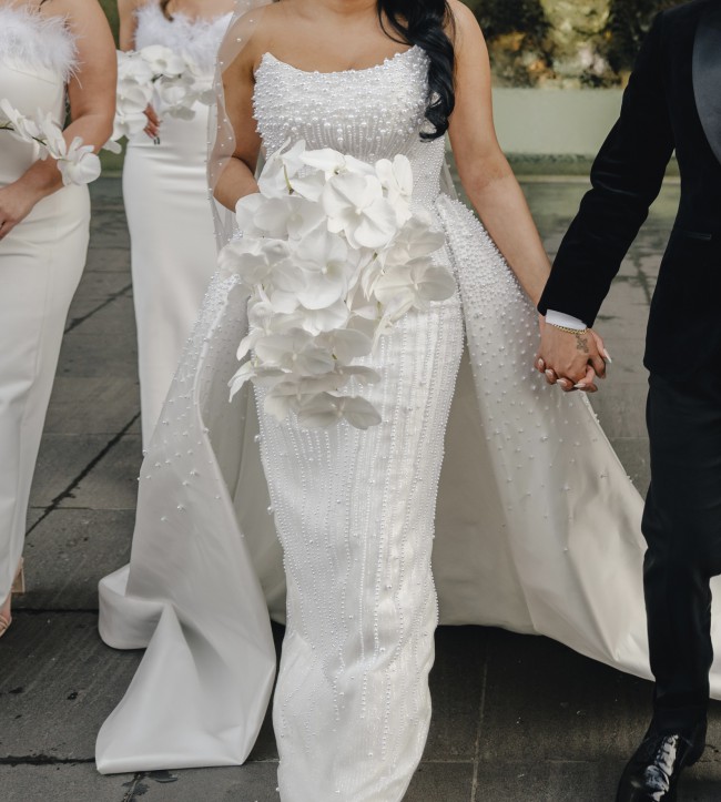 Custom made and fully beaded LPC wedding gown, crafted with care and attention to detail. This beautiful gown features a fully beaded pencil dress with a back slit for ease of movement, and a satin detachable skirt that is beaded halfway down. The button closure runs all the way down for a classic, elegant look.