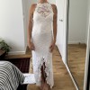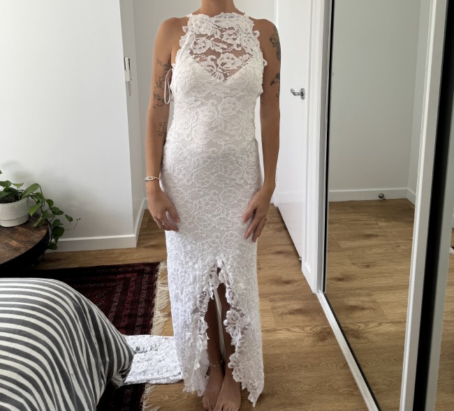 This is a beautiful fitted lace dress with a high neck line and low back, incredibly comfy. The dress will come in the original grace love’s dress bag.