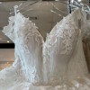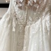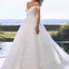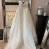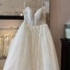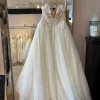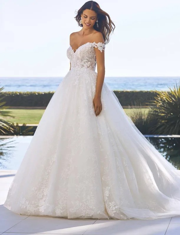 An unashamedly feminine gown for the romantic bride. Constructed in embossed tulle with a touch of glitter. The lace bodice features delicate dropped shoulders in hand-threaded lace. This classic, elegant wedding dress is perfect for your special day!