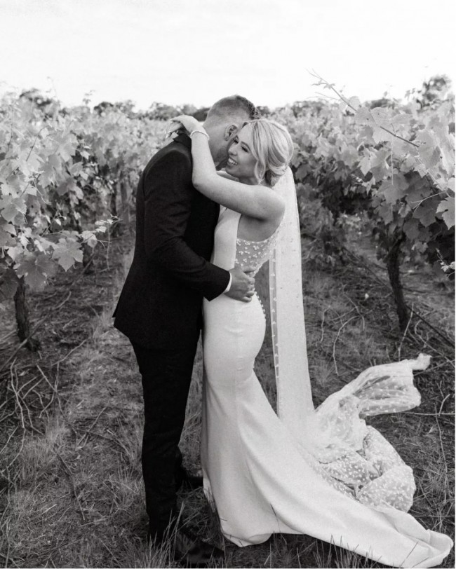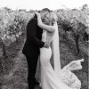 Rosey crepe effortlessly combines Made With Love Bridal's classic, luxurious French crepe with a modern and flirty pop of Rosey's iconic lace in her back panels. The dress has a dramatic full crepe train and a deep v neckline. Rosey's pattern beautifully flatters and supports the shape of every bride and her additional hand-stitched crepe buttons and illusion crepe belt are the perfect additions to frame your curves.