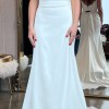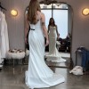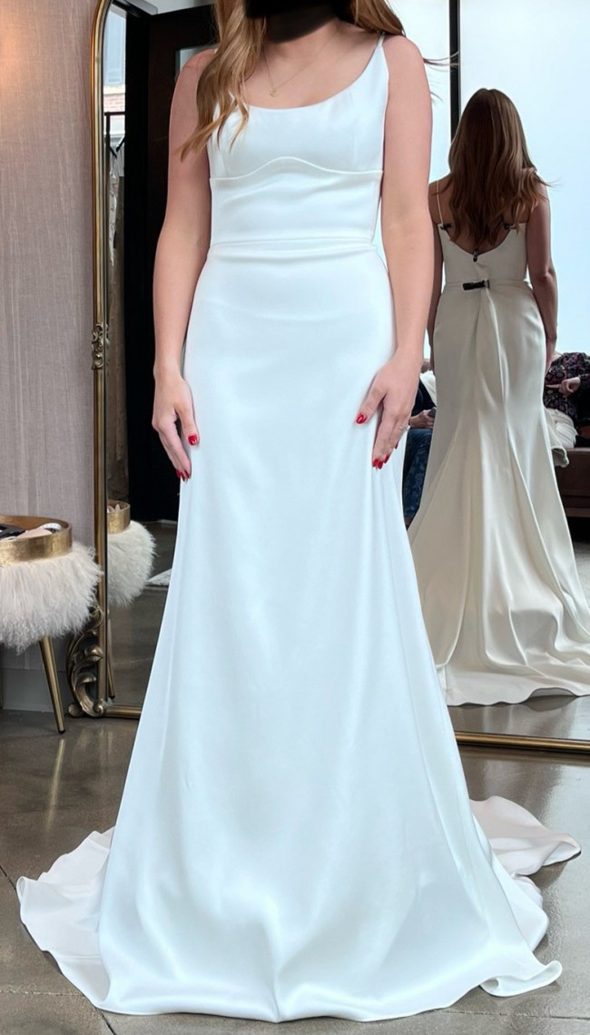 This Amaro dress by Laudae is a satin mermaid wedding gown with a scoop neck, bust contour waistband, and buttons down the back.