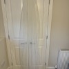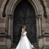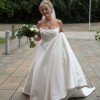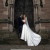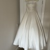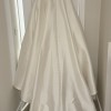 I wore it for a few hours on our wedding day and loved every second of it. The fabric is Mikado and is ivory in colour. I have had it dry cleaned and it looks immaculate, however there are a few slight marks on the underside where the dress/train touches the floor but cannot be seen when worn. There is a bow which can be attached for a bustle but I did not use this. It has 2 very handy pockets!