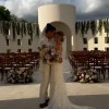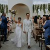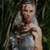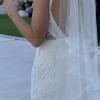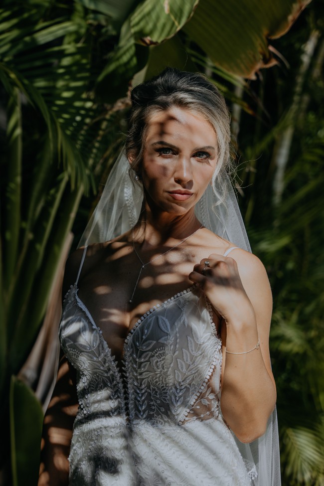 Isla is a bohemian beauty for the fashion-forward bride. Made of two different botanical laces developed especially for Rish, this gown is truly one-of-a-kind. A plunging neckline and side cutouts draw the waist in for a flattering effect, while the figure-hugging skirt shows off your gorgeous curves. 3D lace elements on the skirt and dainty crystal and pearl embellishments add a subtle texture and just the right amount of detail, while the low V-back and long dramatic train make this gown a true showstopper! A matching tulle bolero with a high neck and lace-embellished bishop sleeves adds a boho touch to this glamorous gown.