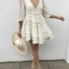 Made from 100% linen, this dress features a flattering plunging v-neckline and beautiful balloon sleeves, giving you a sophisticated yet fun look. The mini length adds a playful touch, while the asymmetrical hemline and sheer lace panels throughout create an elegant silhouette that is sure to turn heads.