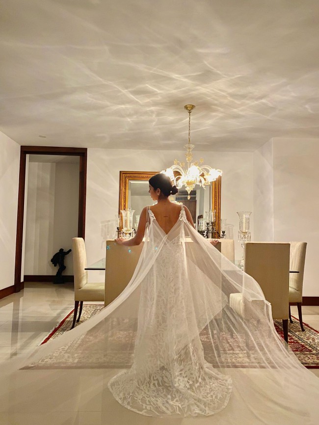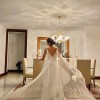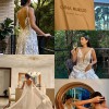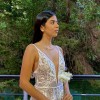 Wedding dress made of embroidered tulle with designs, tie straps on the shoulders, A-line skirt with a deep V-neckline at the front and back.