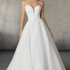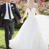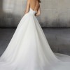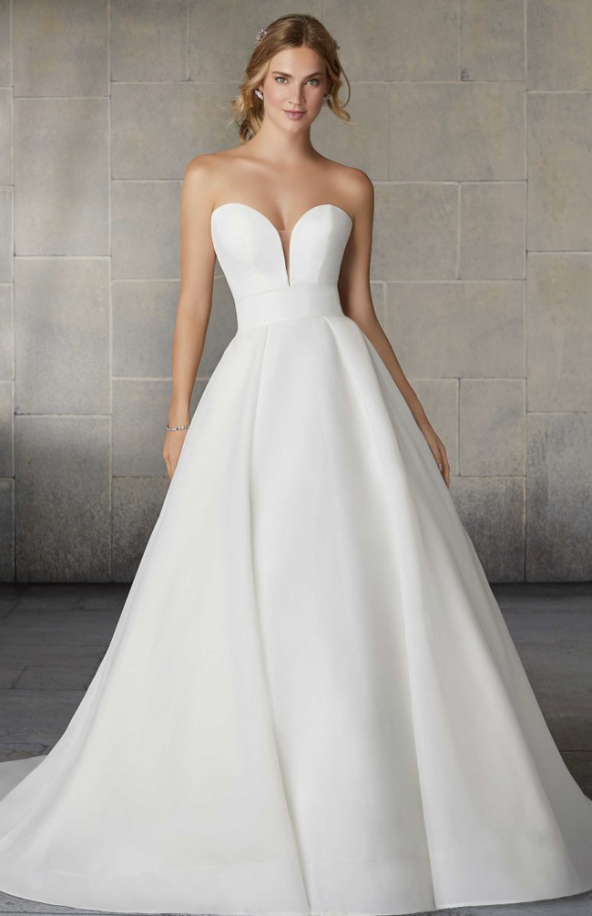 Simply stunning, our Sadie bridal gown features an organdy A-line silhouette with full ball gown overlay and a sheer train accented with wide horsehair trim.