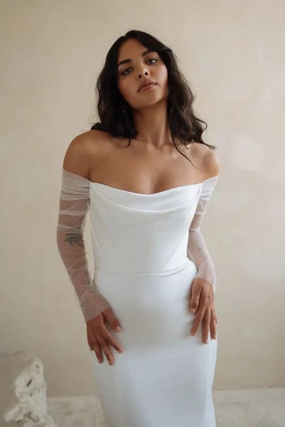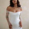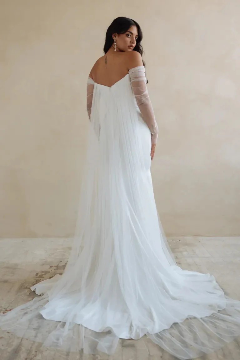 Brand new Jenny Yoo Olivia wedding dress with original tags and garment bag included! Photos show the in-store sample, dress itself is unworn and has not been altered. Dress has draped off-the-shoulder sheer sleeves (not detachable) and tulle wings on the back (detachable). There is a zipper in the back but it's covered by buttons that go down to the bottom, and the dress is fully-lined.