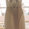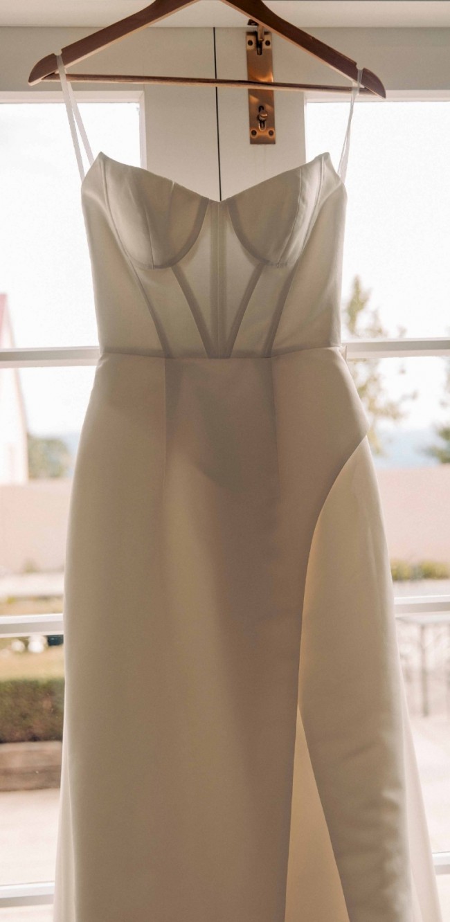 Rachael Rose wedding dress, beautiful flattering a line design. Small train, small buttons behind the armpitt for if you would like to have sleeves made to attach. High leg split & boning in bodice.