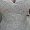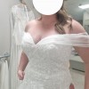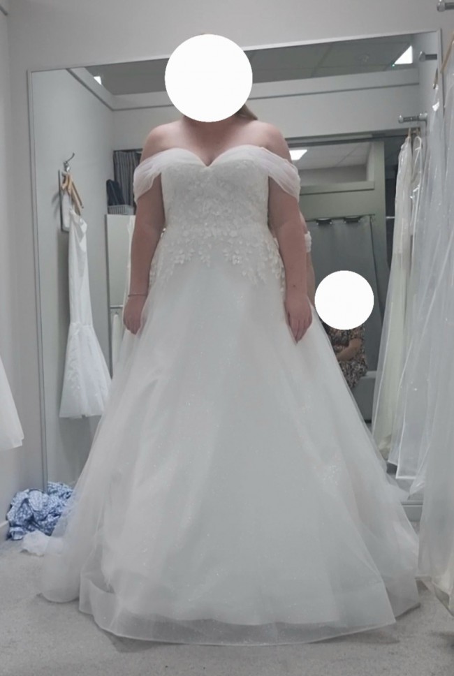 Chiffon off the shoulder sleeves, sweetheart neckline, lace top with sequins. Skirt is chiffon but has a beautiful sparkle to it you can just about see in the picture. I have a video of me walking in it where you can really see the sparkle which I'm happy to send individually.
