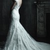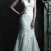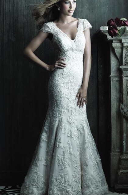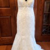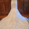 A stunning couture wedding gown by Allure. This is a very vintage lace with a gorgeous ivory color. Very delicate lace trimmed hem and a stunning cathedral train. This is the perfect gown for that sophisticated bride.