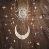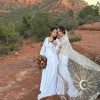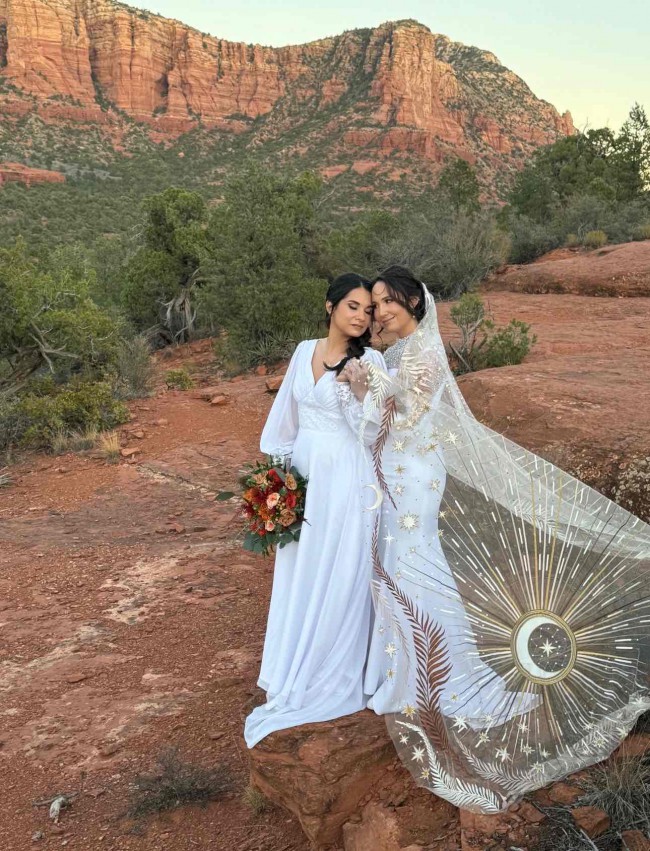 This one of a kind handmade “Desert Rose” veil is made in New Zealand with embroidered celestial designs. It is the star of the show.