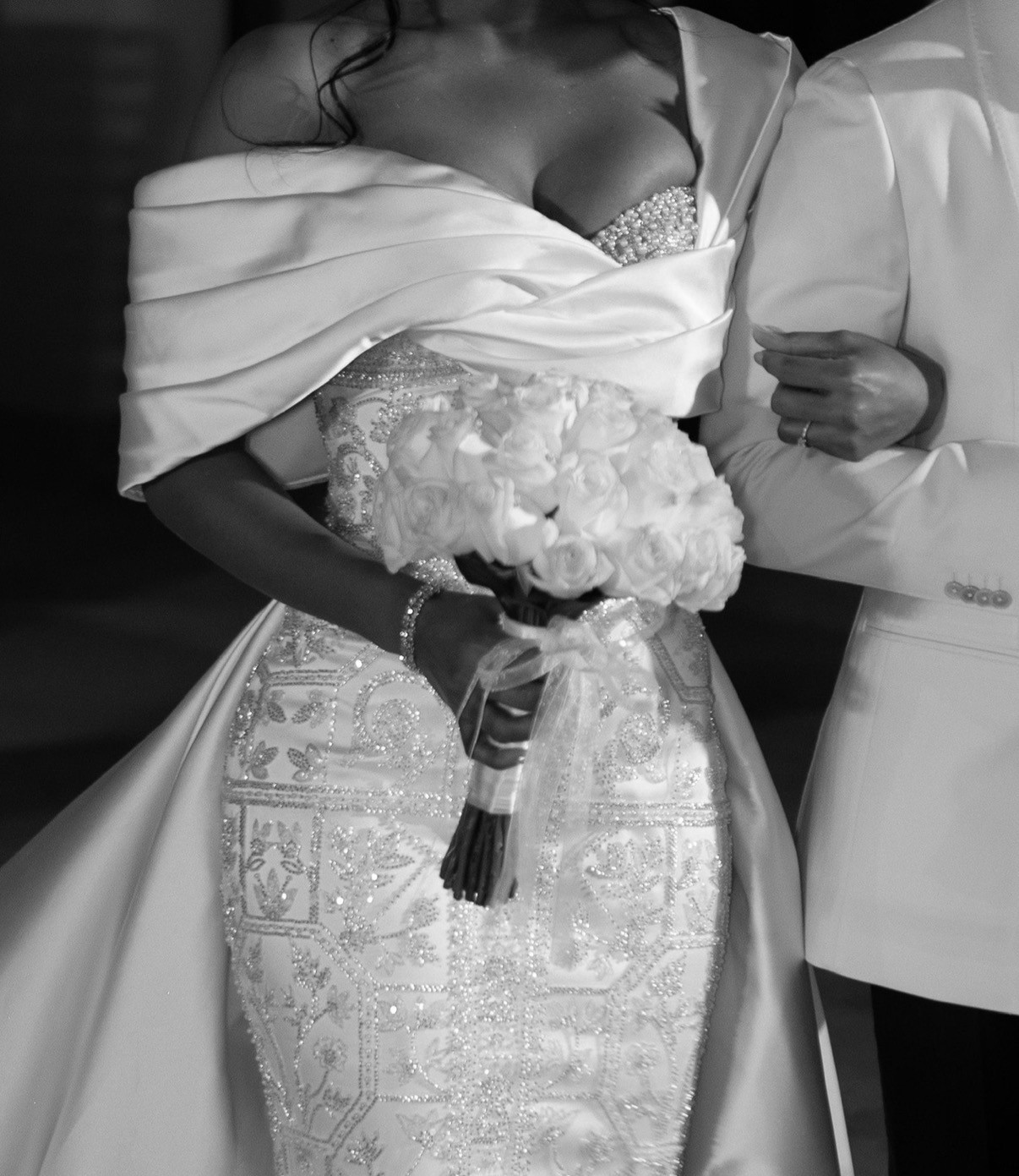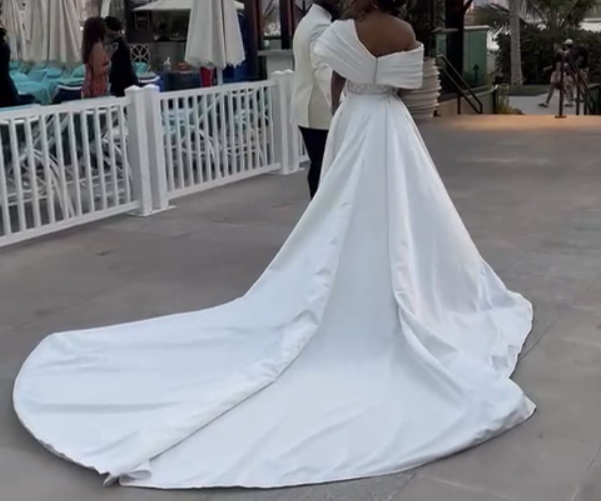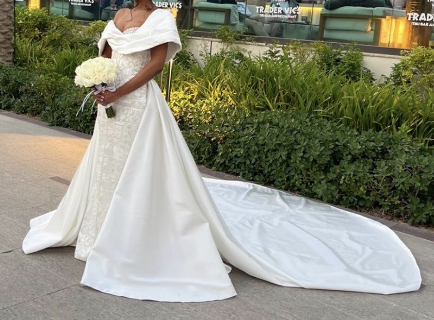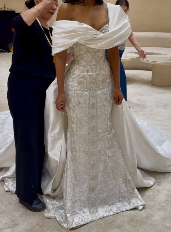Valdrin Sahiti Custom made dress (see design drawing). Custom Made beaded dress with detachable satin train/overskirt. December 2024 Please not that the measurements can be slightly different on the dress as we made last minute adjustments (lost a bit of weight).