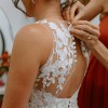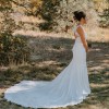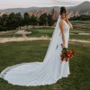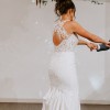 The elegant long train is a true showstopper, adorned with intricate lace detailing that adds a touch of ethereal beauty as you glide down the aisle. The keyhole back design is both modern and alluring, striking the perfect balance between elegance and contemporary style.