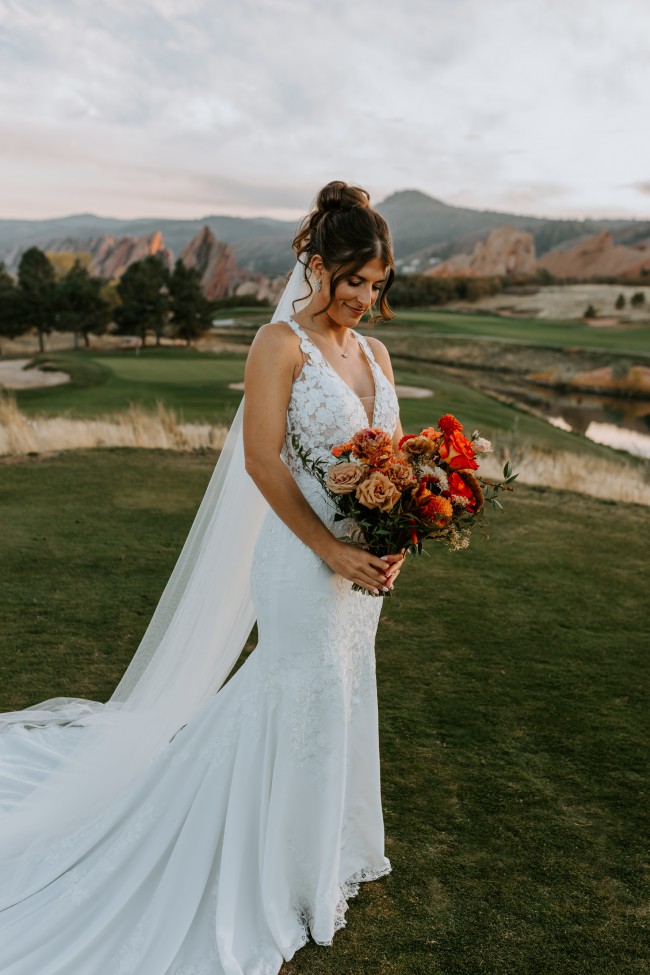 Step into elegance and romance with this breathtaking fit-and-flare wedding dress, featuring exquisite floral detailing that cascades down the gown. The florals are thoughtfully designed to ensure a tasteful and polished look on the top, offering flattering coverage while enhancing curves beautifully. This designer dress seamlessly combines modern sophistication with timeless charm.