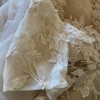 The dress originally had longer and tighter sleeves - changed the sleeves to be shorter and more flowy while incorporating the lace flowers from the original sleeves sewn onto the excess fabric cut during normal alterations. Also, a bustle was added!