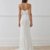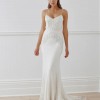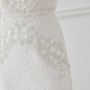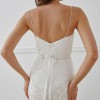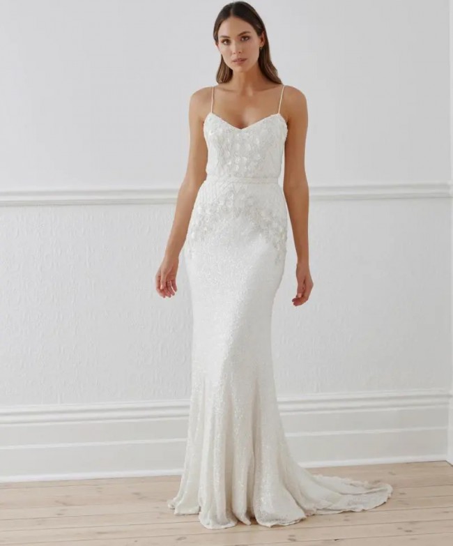 This gown looks like a structured, tailored wedding dress but by beading the sequins onto a bias cut skirt these dresses have flexibility in the fit and will accommodate many different body shapes. The weight of the sequins allows the dress to skim the body in a figure flattering way.