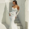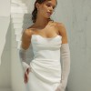 Step into timeless elegance with the Haven dress, where chic meets romance in a sleek strapless crepe gown. Crafted to perfection, this gown features a structured sweetheart neckline adorned with draped bodice details, embellished in textured organza for a touch of ethereal charm. Delicate ruching along the waistline adds graceful definition, enhancing the silhouette with understated allure and feminine sophistication.