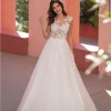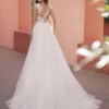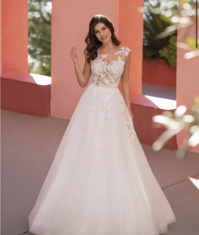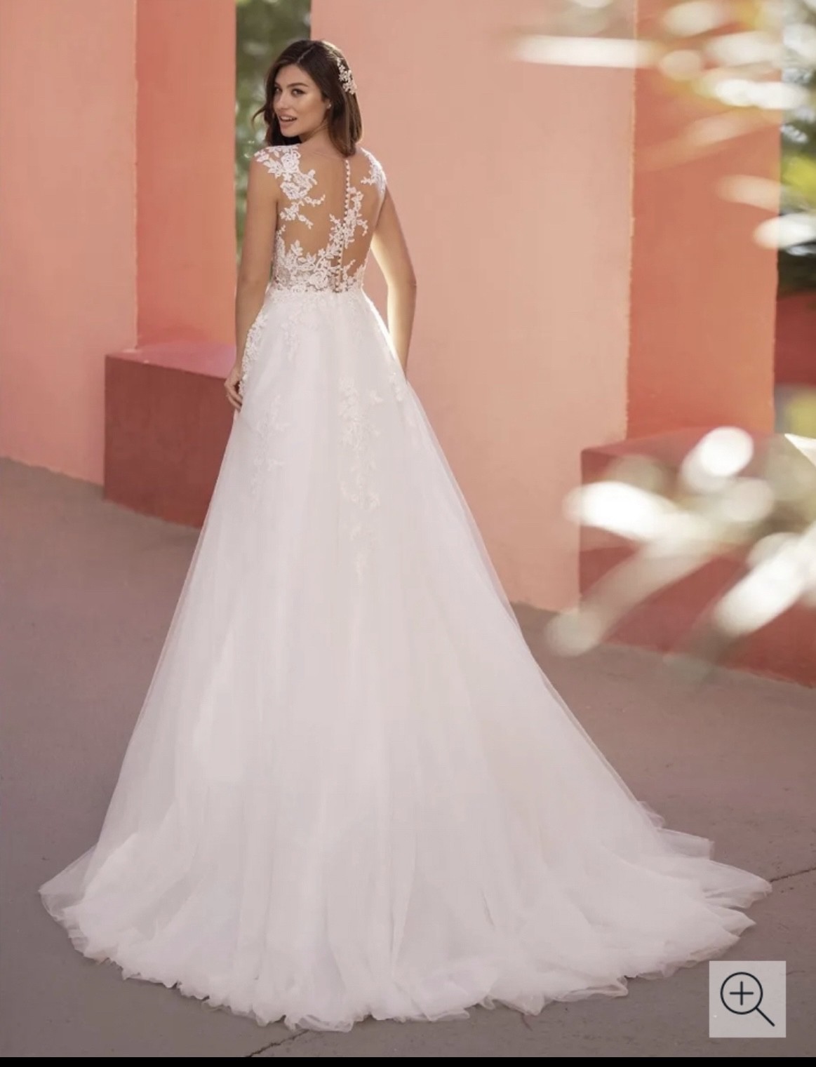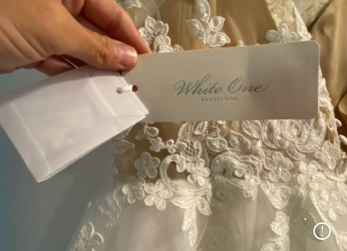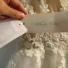 Brand new with tags never worn. Lace, chiffon, and tulle with some beading. It is from Spain, it’s a size 22 on the tag but at the time I was a US 14/16. I’m 5”6 in height. It also comes with a removable strapless bra which was never worn..
