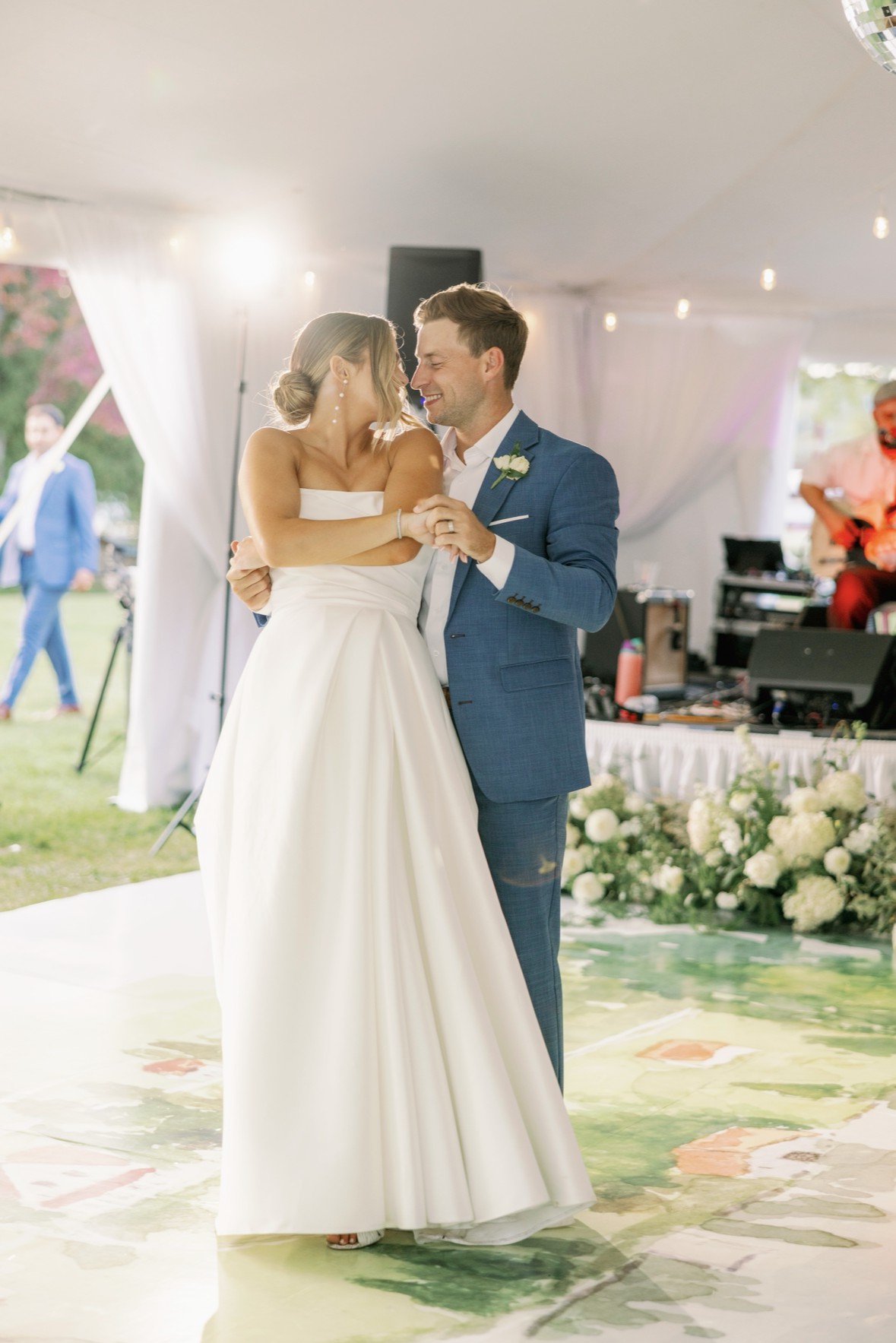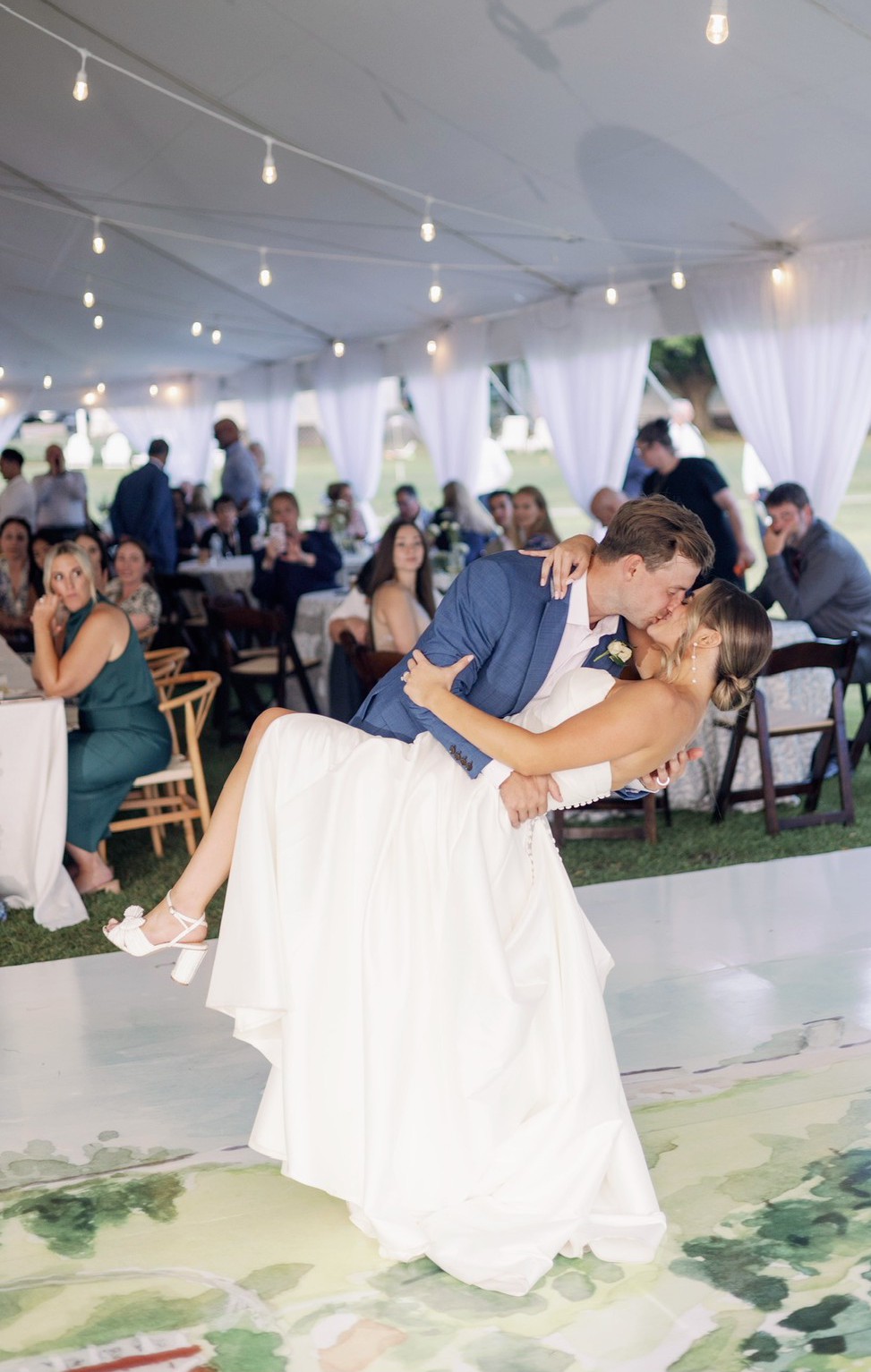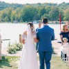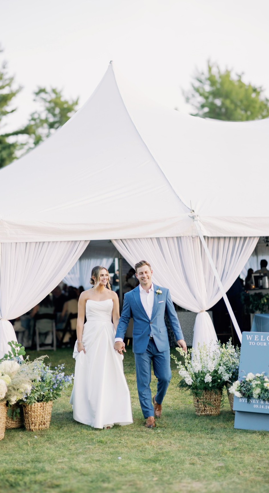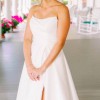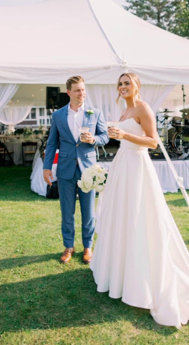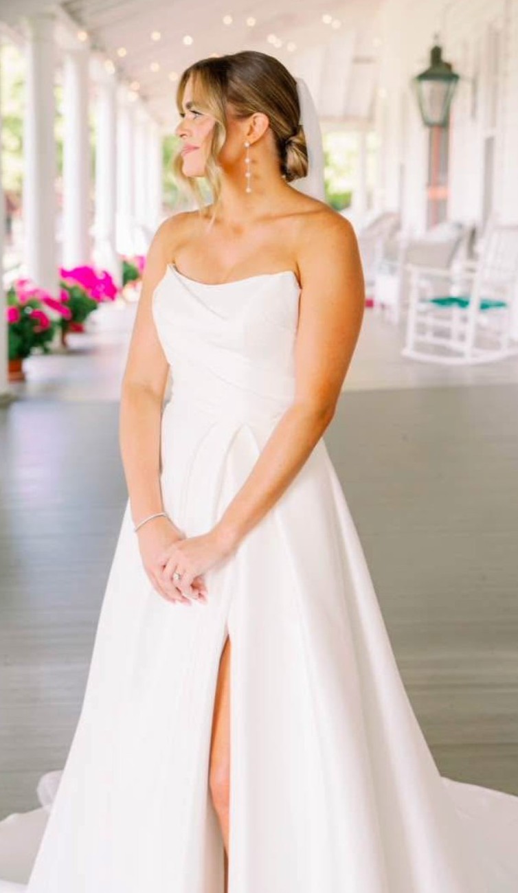 Louvienne Malea dress purchased at Lovely Bride Chicago. A line style with pockets, slit, and additional buttons added to run down the entire back of the dress. The peaked bodice is incredibly flattering and I loved capturing a traditional look with a modern touch with the slit! Professionally dry cleaned immediately after the wedding but there are some light dirt stains along the hem line (would be eliminated if hemming) from dancing the night away at our outdoor wedding! No alterations to the bodice. I had the slit stitched for modesty/to control when I wanted the slit vs a more traditional look but stitch could easily be cut for a more dramatic look.