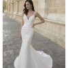 Never worn. Minimalist, modern mikado gown. Structured but comfortable fabric gives a sophisticated vibe. Draped bodice with delicate straps makes it both figure flattering and worry-free. Chic, classic flowy train with buttons down the middle. This gown has not been altered so it can be made to fit you perfectly!