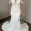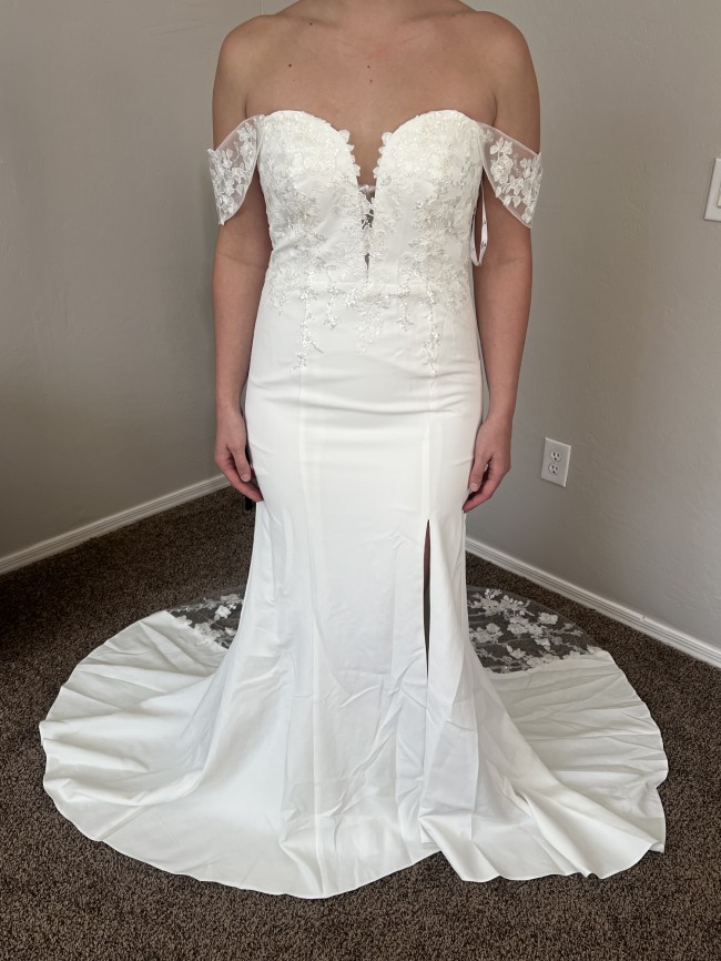 To no fault of its own I’m selling what I thought was my dress but completely fell in love with another! Has detachable sleeves. Beautiful sequins throughout the top of the dress and beautiful mesh, floral and sequins train. Above the knee slit as well. Size 10 and it’s not altered!