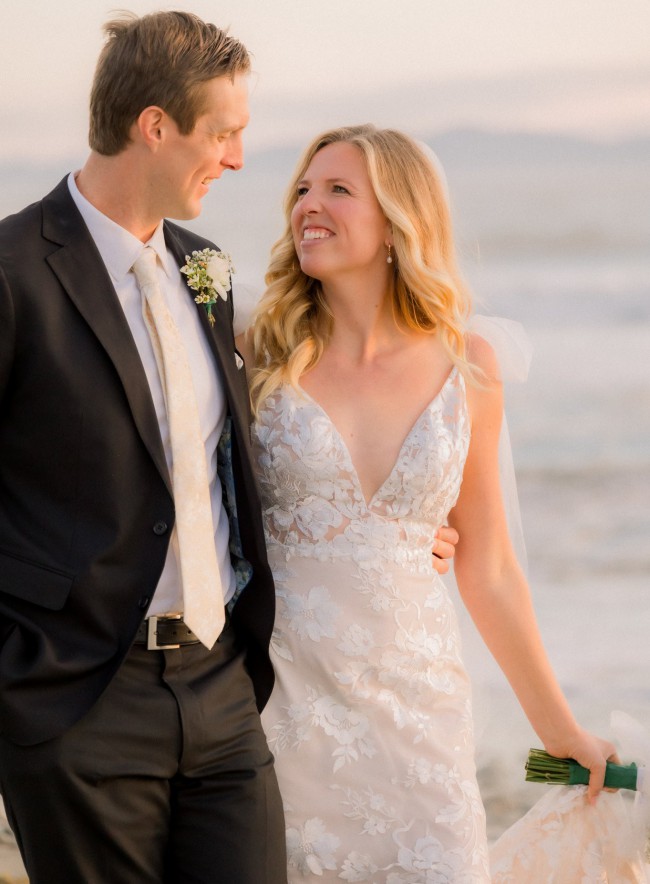 Her plunging neckline, illusion tulle sides and stunning train add a subtle touch of drama that contrasts flawlessly against her classic, fitted skirt silhouette.