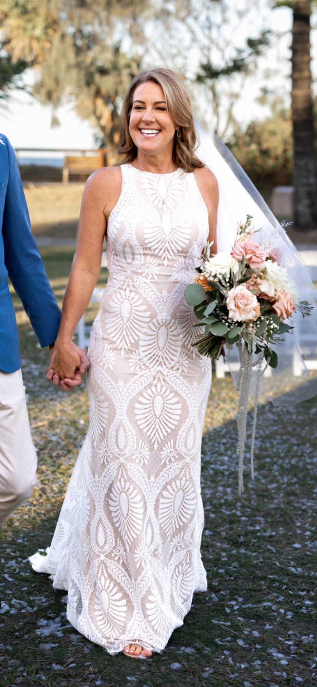 This F116 Marlowe gown from Wilderly Bride made my wedding day feel like a dream come true. The intricate lace with delicate crystal accents sparkled beautifully in the sunlight, adding a touch of magic to every moment. It has a stretch champagne underlay with stretch lace. Its high neck design provided elegance and sophistication, while the backless feature offered a hint of allure that made me feel utterly confident.