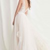 The V-neckline adds a touch of allure, elegantly framing your décolletage, while the V-back detailing offers a chic twist that will turn heads from every angle. Adorned with Willowby's unique Wildfeld lace embroidery, this dress showcases artistry and craftsmanship with delicate ivory, rose gold and silver threads adding dimensions to an ethereal gown.