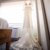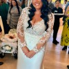 Lace motifs over Merona stretch-crepe, Illusion lace bodice, Plunging illusion V-neckline, Deep illusion lace V-back, Illusion long sleeves with lace appliqués, Lined with Virtue stretch jersey for comfort, Zipper with covered button closure, Illusion lace cutout train.