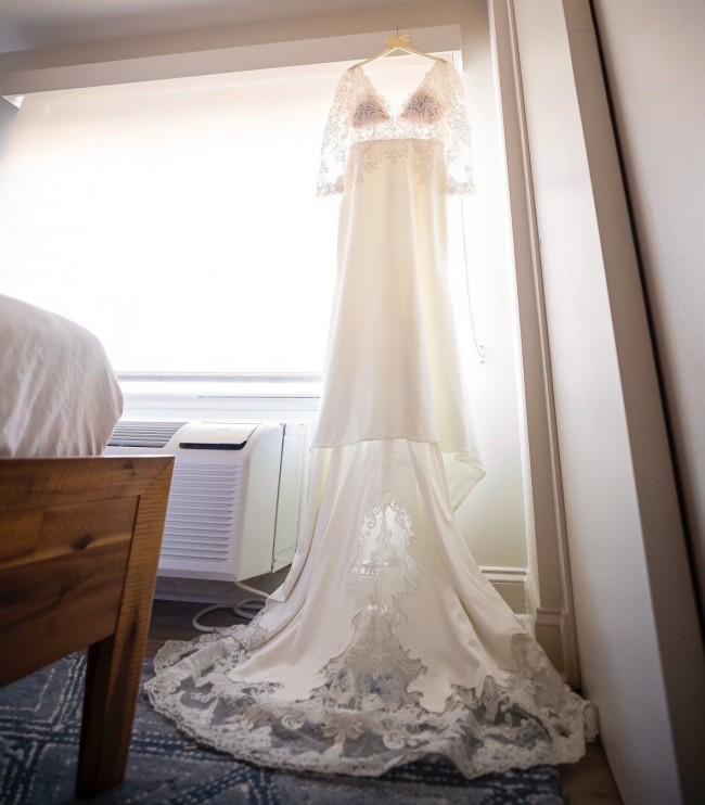 A gorgeous long-sleeved sheath wedding dress is a perfect balance of classic and contemporary trends. Illusion lace in a full-coverage bodice gives this a veiled-unveiled kind of vibe.