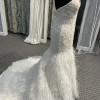Crafted from delicate ivory lace, this dress features intricate beading and embroidery that catch the light beautifully, adding a touch of shimmer to your special day. The trumpet skirt covered with hand sewn ostrich feathers gracefully flow from the hem, creating a sense of movement that is both dramatic and delicate. Perfect for a grand celebration or an intimate gathering, this floor-length gown promises to complement any wedding theme.