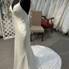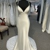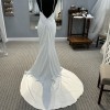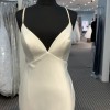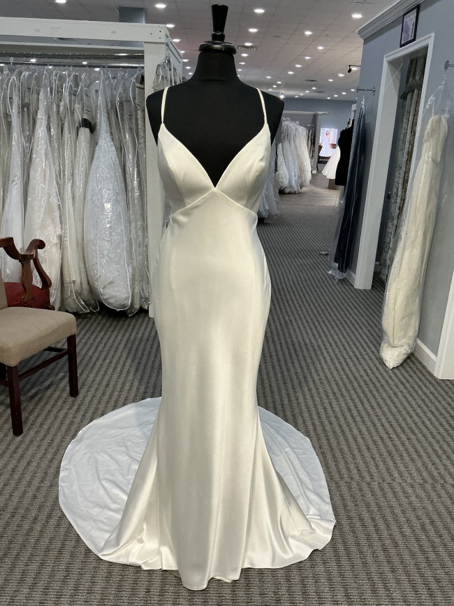 This stunning Rebecca Ingram wedding dress, known as the Murphy, embodies elegance and romance in every meticulously crafted seam. Designed for the modern bride, this trumpet silhouette flatters the figure beautifully, accentuating curves while providing a sophisticated profile that flows gracefully to a floor-length hem. The luxurious ivory satin fabric drapes effortlessly, offering a subtle sheen that catches the light as you move, making your entrance as memorable as your vows.