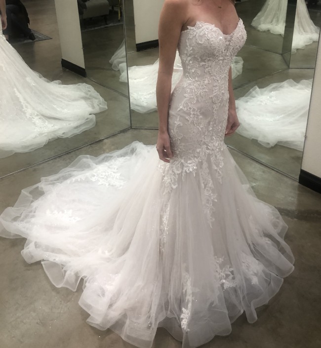BRAND NEW. NEVER WORN. Maggie Sottero Misty Mauve Lonnie Lynette Size 4 wedding dress. It's made of glitter tulle and floral lace, and has a strapless bodice with a sweetheart neckline. The dress has a lined bodice and a corset back with a panel. I'm 5'6 and had 3 inches taken off the bottom of the dress to make it the ideal height with heels, no other size alterations were made.