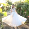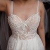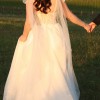 As described by the designer, this beautiful floor length dress has a full A-line skirt with a nude top half that gives it a sophisticated and unique look. The dress is made from layered tulle with sparkling lace throughout. Soft tulle bows hang from the shoulders or can be worn up on the shoulders like straps. The colour of the veil is ivory and rest of the dress is ivory.