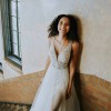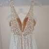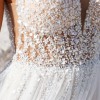 Decadent beading features a mix of pearls, sequins and bugle beads showering over the sheer bodice--contrasting beautifully with the full, lush tulle skirt that flares from the waist and flatters the figure, A sexy high slit within the skirt also makes a surprise appearance, for a stunning strut down the aisle. The V-neckline and open V-back take this bold, fashion-forward look to a level that is utterly classy and totally timeless!