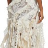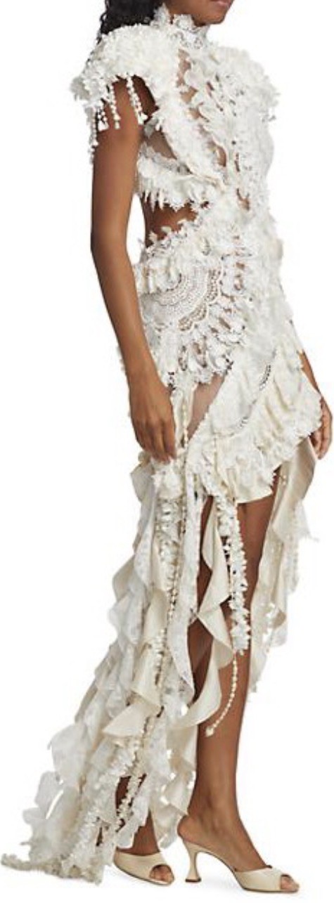 The Wonderland dress from Zimmermann is designed in a maxi length with maximalist lace decor. The upper bodice features intricate lace and floral embellishments, while the skirt is designed with a high-low hem, boasting ruffles and shells cascading downwards.