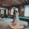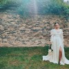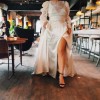 The circle skirt features a provocative side slit that can be opened with a water Pearl button, A mid length tail with option to bustle with a water Pearl as well. It has an amazing butter-like luxurious texture.