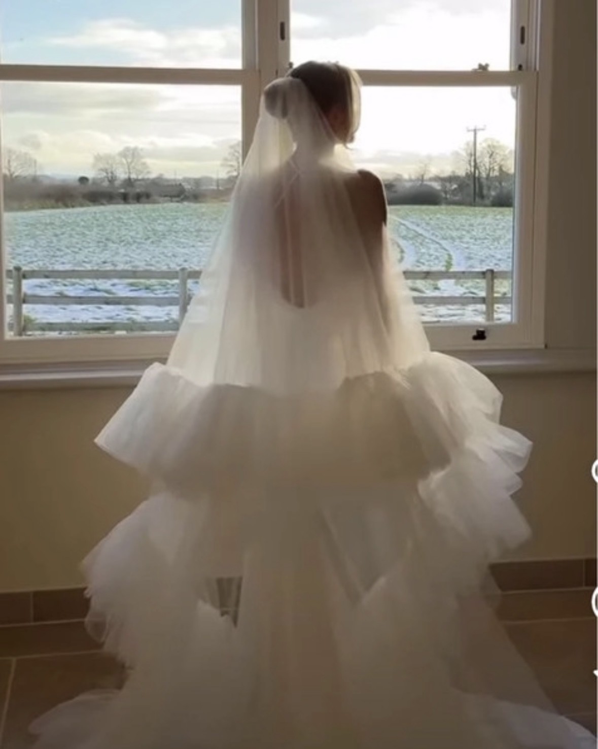 It has never been altered. It was bought at a sample sale and I’ve changed my mind. I’ll also include the cathedral length ruffle blusher veil I bought for £70 in this sale.