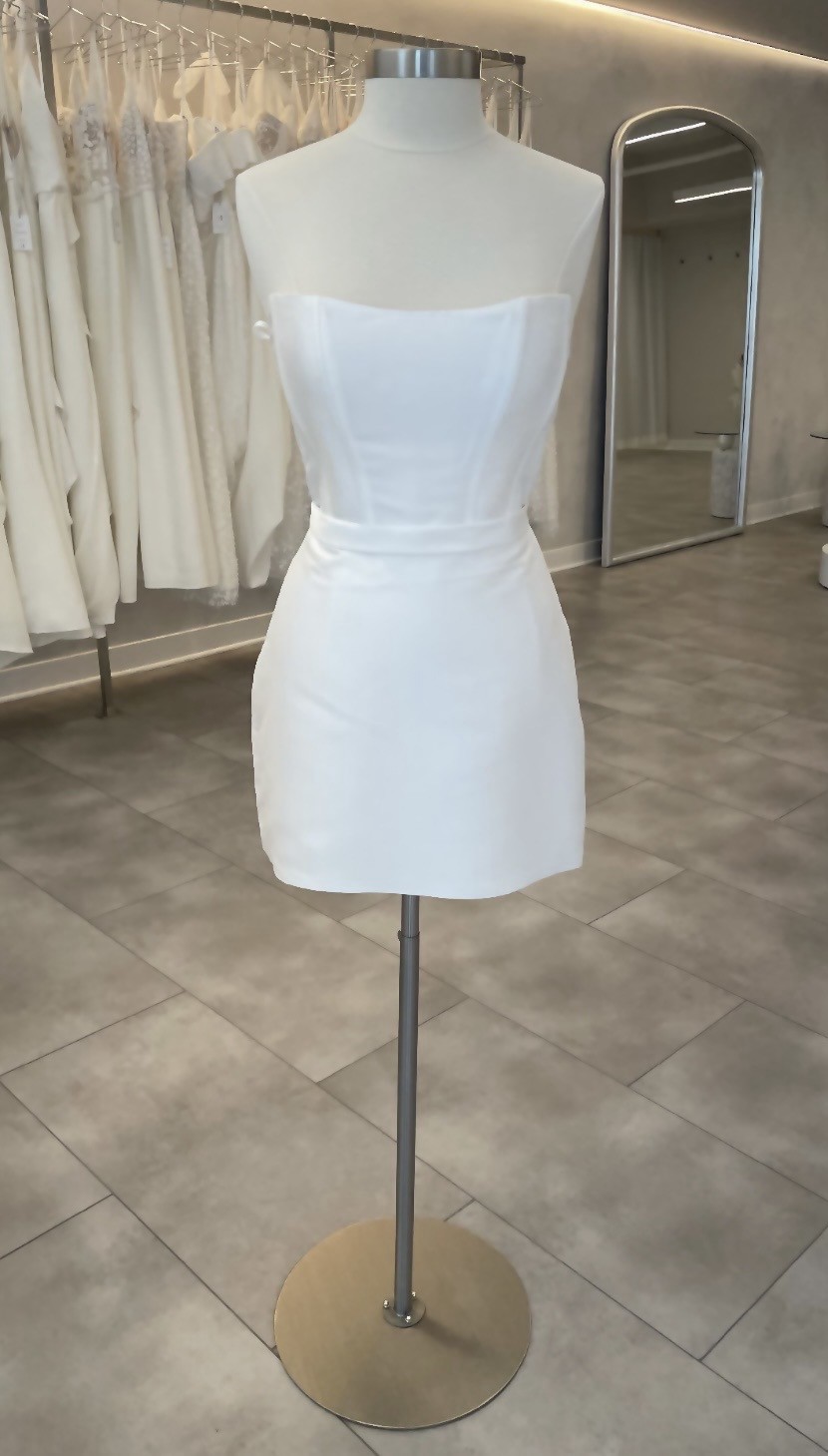 Description: Mya combines our favourite Made with Love elements to create the perfect two-look beauty! Pair our Mya mini dress with her matching full, luxurious Mikado overskirt for a classic yet dramatic bridal aesthetic, with just a peek of playfulness through her thigh-high split. Mya's peaked bodice pattern alongside the perfectly contoured boning ensures the most flattering fit on any shape.