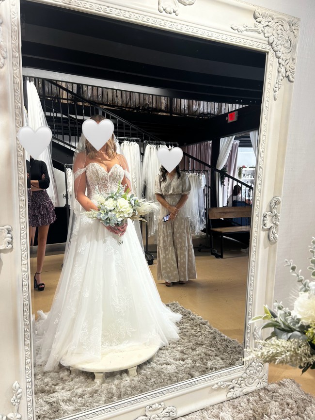 The strapless design showcases the shoulders and collarbone, while the delicate 3D flowers add a unique, textured detail that catches the light beautifully with every step. Perfect for brides who love a touch of whimsy, these floral embellishments create an enchanting visual element that brings the dress to life. For added versatility, detachable sleeves can be easily included or removed, allowing the bride to customize her look from ceremony to reception.