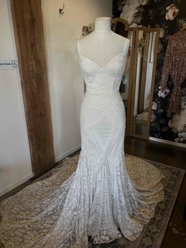 A sample gown from the floor in excellent condition. Cassian gown by Rue De Seine is a classic wedding dress with a fit and flare silhouette for brides looking for a timeless bridal look.