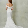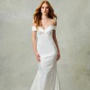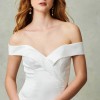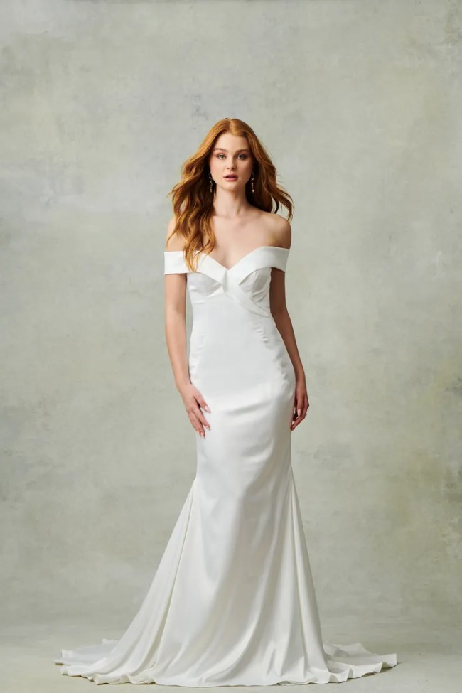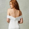 Ivory. Stretch crepe fit to flare gown, off-the-shoulder neckline with wide cuff detail.