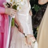 This gown has tones of cream and blush created by five layers of semi-sheer silk organza, starting with an ivory base, followed by blush, anther two ivory layers and an off-white final layer with a delicate white French floral print overlaid. The combination results in a light, weightless, suggestion of translucence which is not sheer or see-through in photos and almost looks iridescent. The dress has a detachable belt and adjustable sleeves.